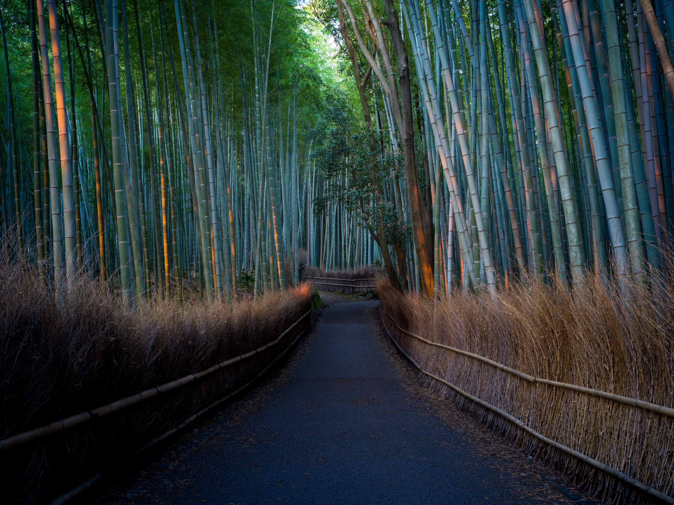 A serene path winds through a towering bamboo grove in Arashiyama, Kyoto, Japan, where sunlight filters through the verdant canopy, casting a warm glow on the smooth wooden walkway flanked by gracefully swaying bamboo stalks.
