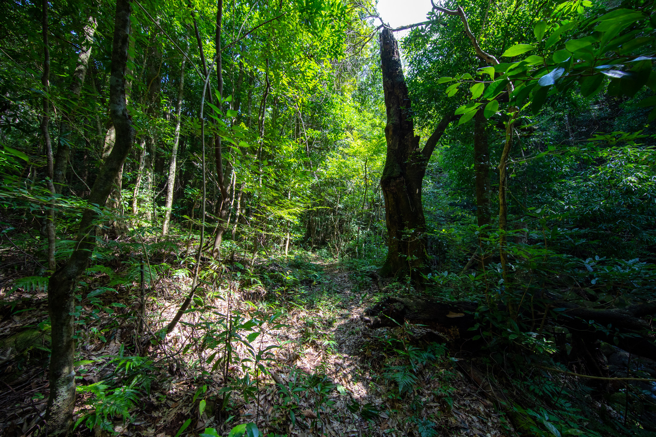 A dense, verdant Japanese forest with ancient moss-covered trees intertwined, their branches forming a lush canopy overhead. The winding path invites exploration into the serene depths of this timeless natural wonderland.