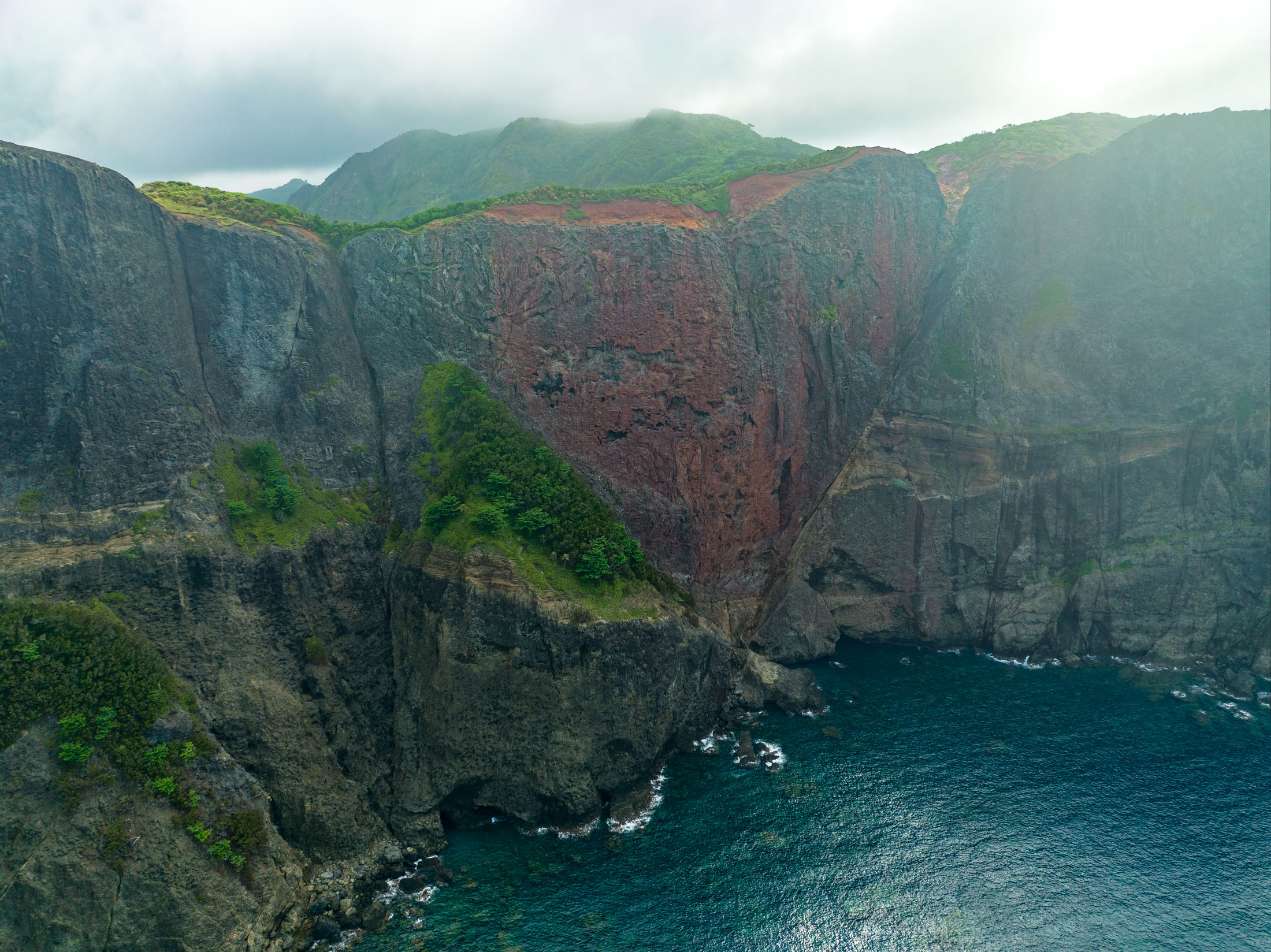 Towering verdant cliffs overlook the turbulent blue ocean, misty peaks in the distance. A heart-shaped rock formation on the rugged shoreline adds intrigue to this dramatic, untamed coastal landscape.