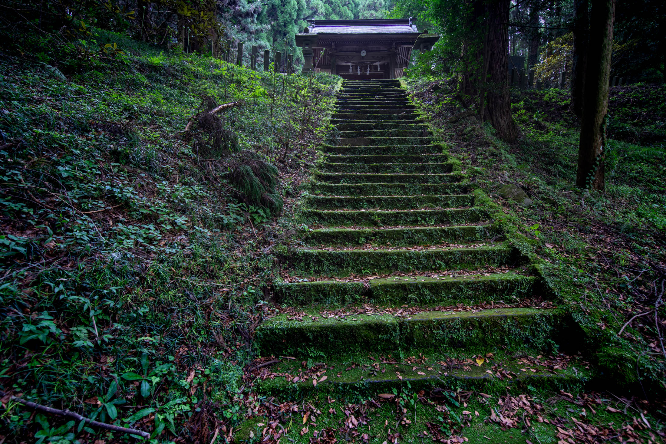 A serene forest shrine with moss-covered stone steps winding through lush greenery, leading to a traditional wooden structure nestled in natures embrace, exuding tranquility and harmony.